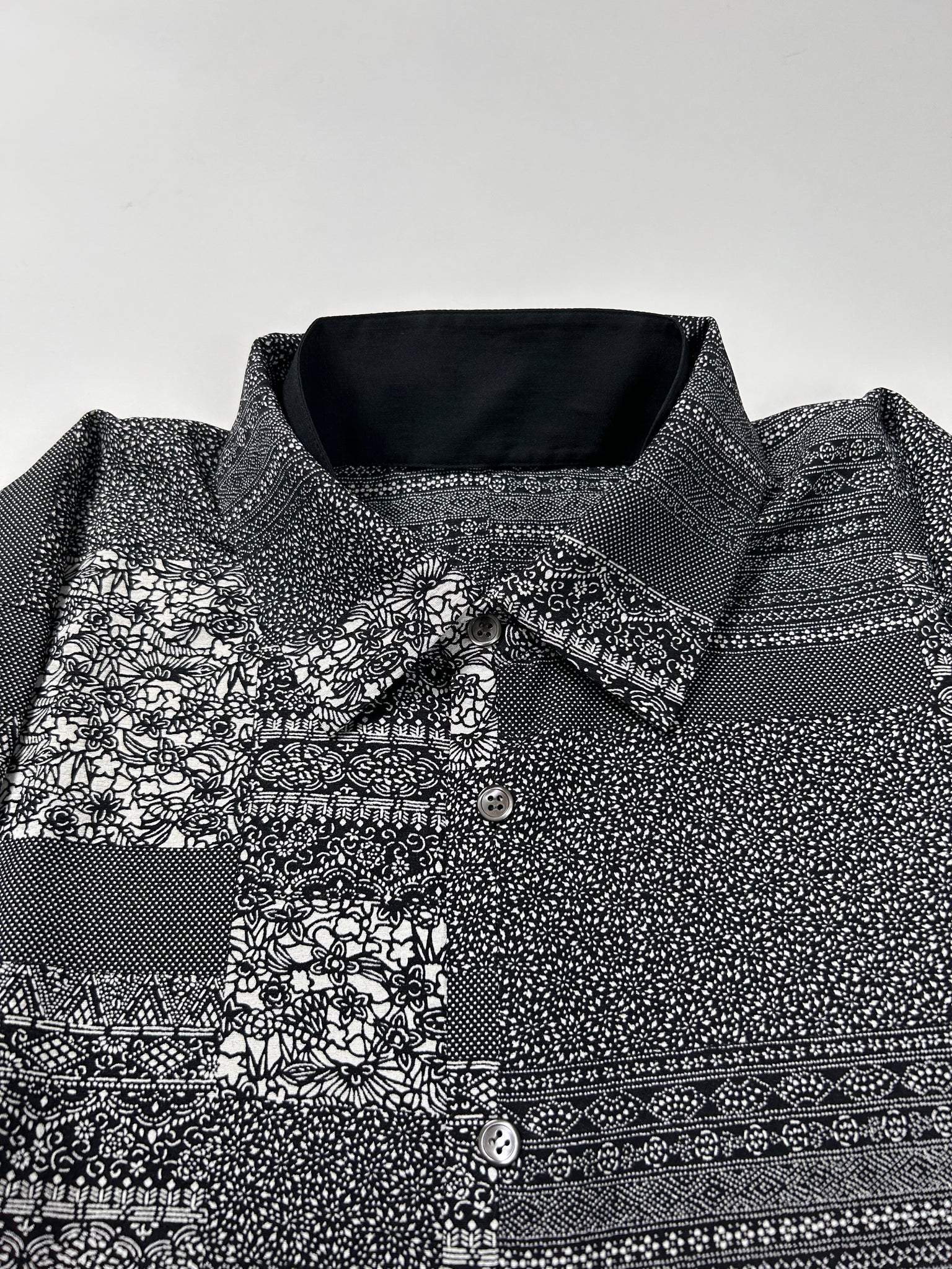 今季は、和裁の縫製仕様を踏襲するだけでなく、より「きものを纏う感覚」に近づけるために、シャツとしての肩線やヨークを省き、首元には付け襟を施しました。これにより、首回りのカーブをお着物の襟に見立てた、独自の設計となっております。