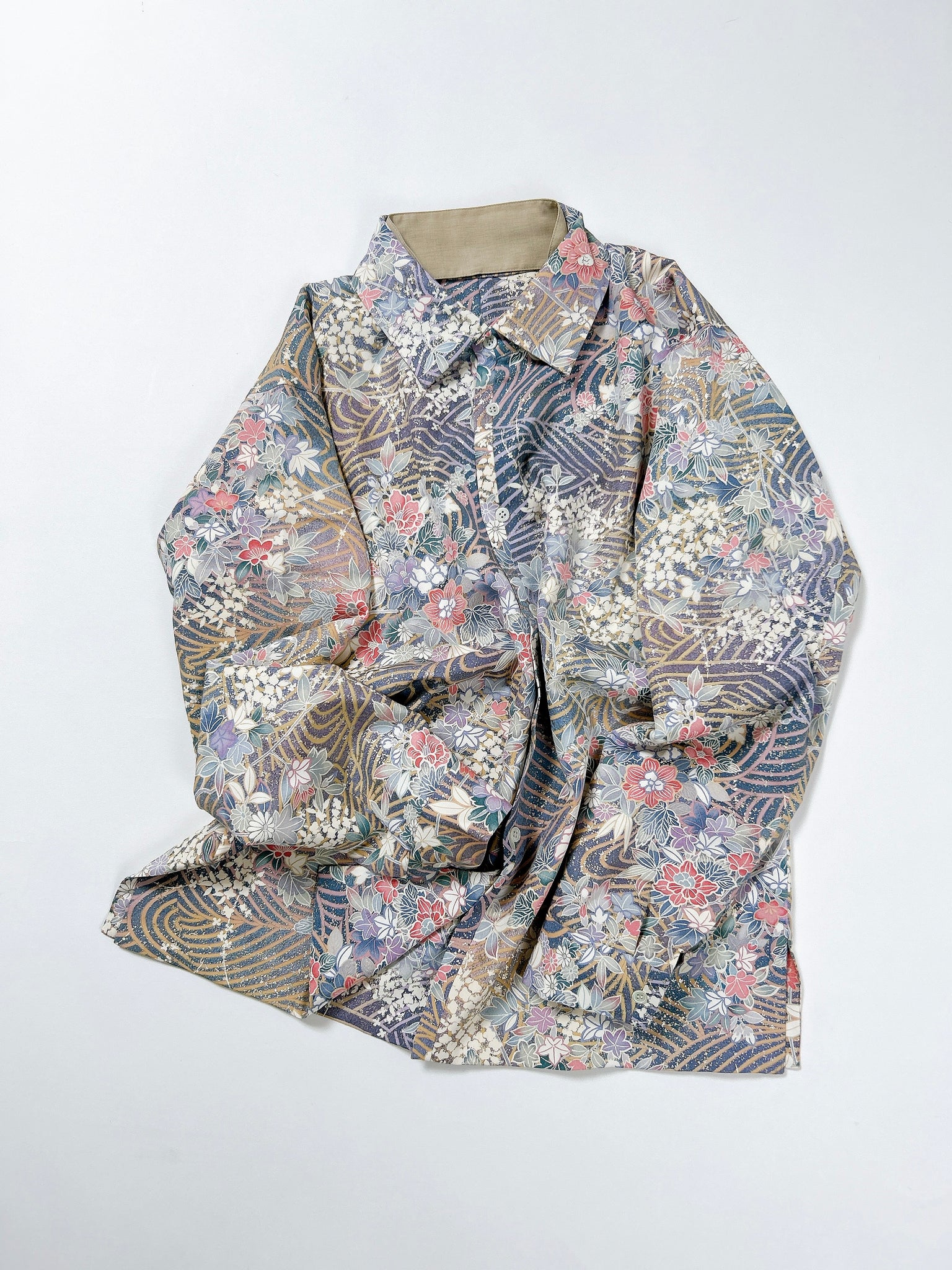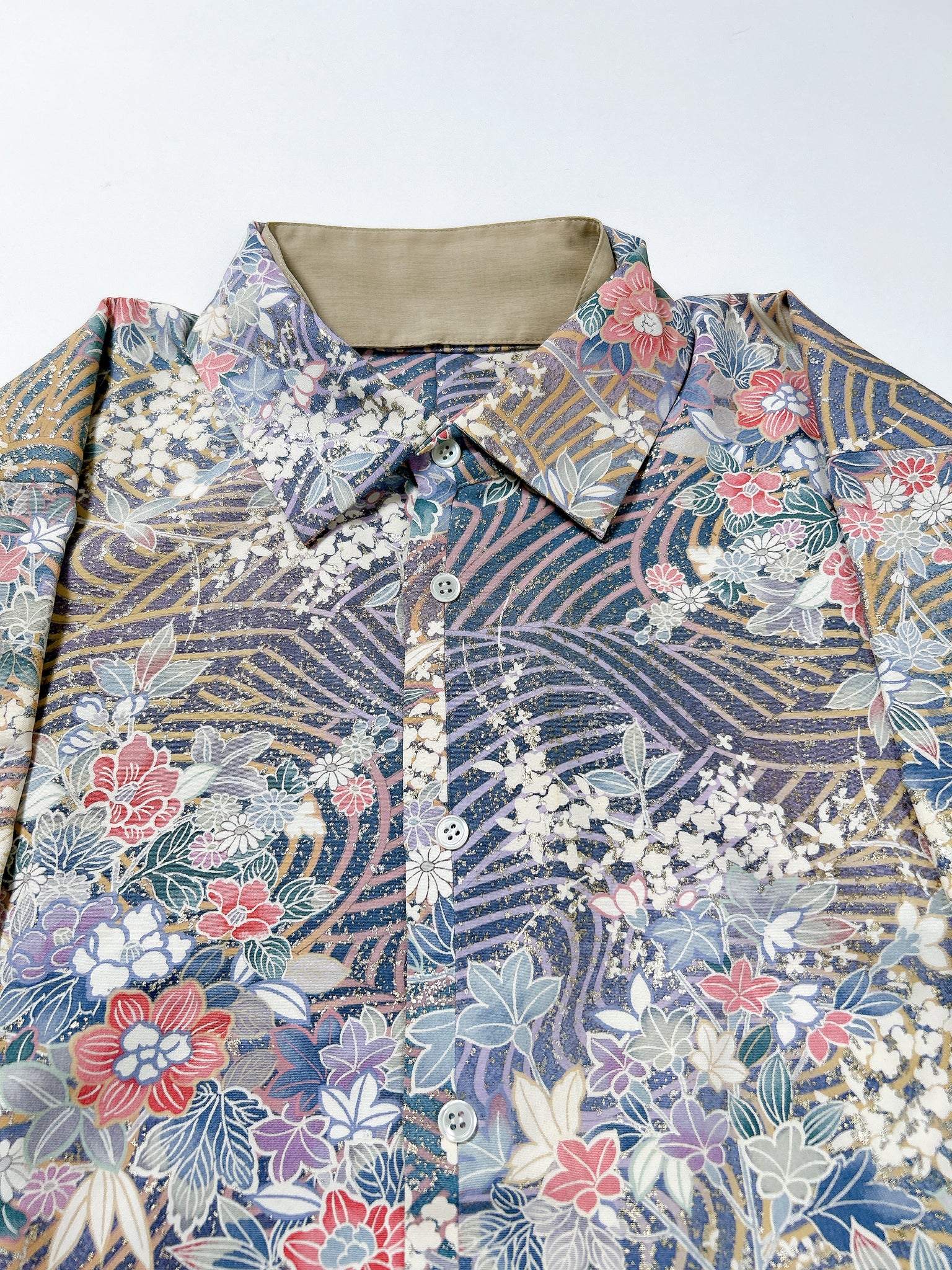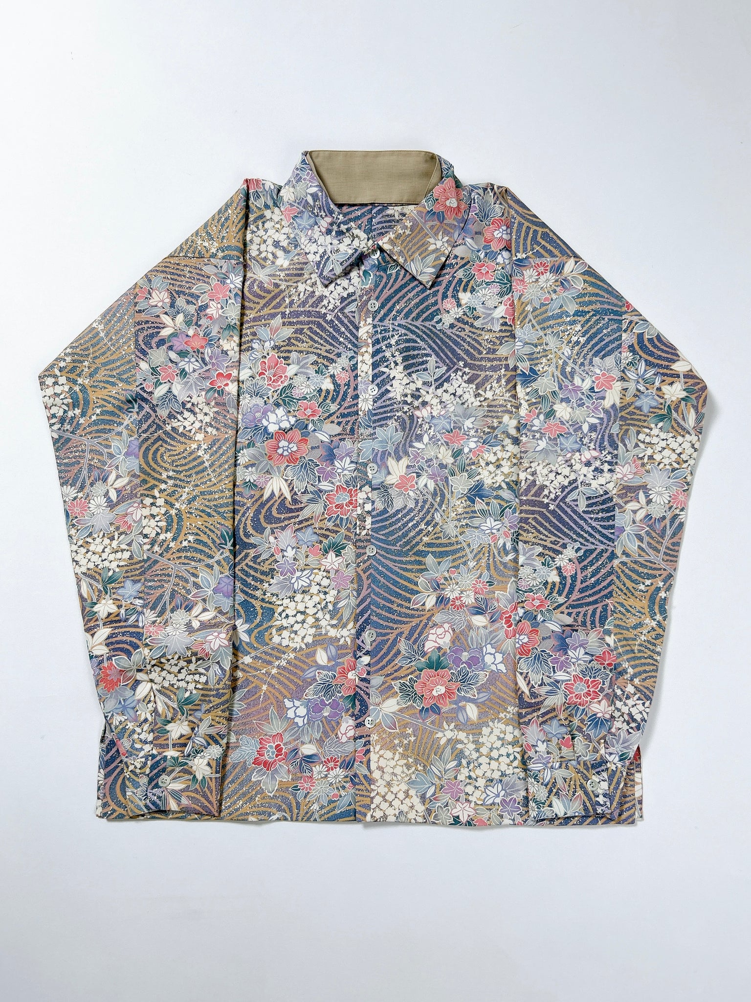 これまでと変わらず、ケニシャツは一反(約12メートル)のお着物生地を余すことなく使用し、総裏仕立ての二枚合わせにてお作りしております。そのため、程よい厚みと重みがあり、お着物一反から一点のみお作りできる、貴重なお品です。